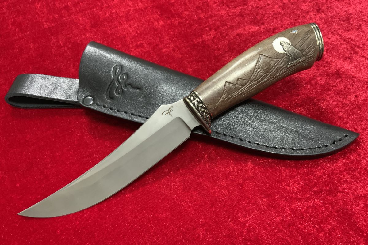 Булатный нож 076 "Одинокий Волк" (легированный булат), И. Пампуха, корень ореха, инкрустация, резьба