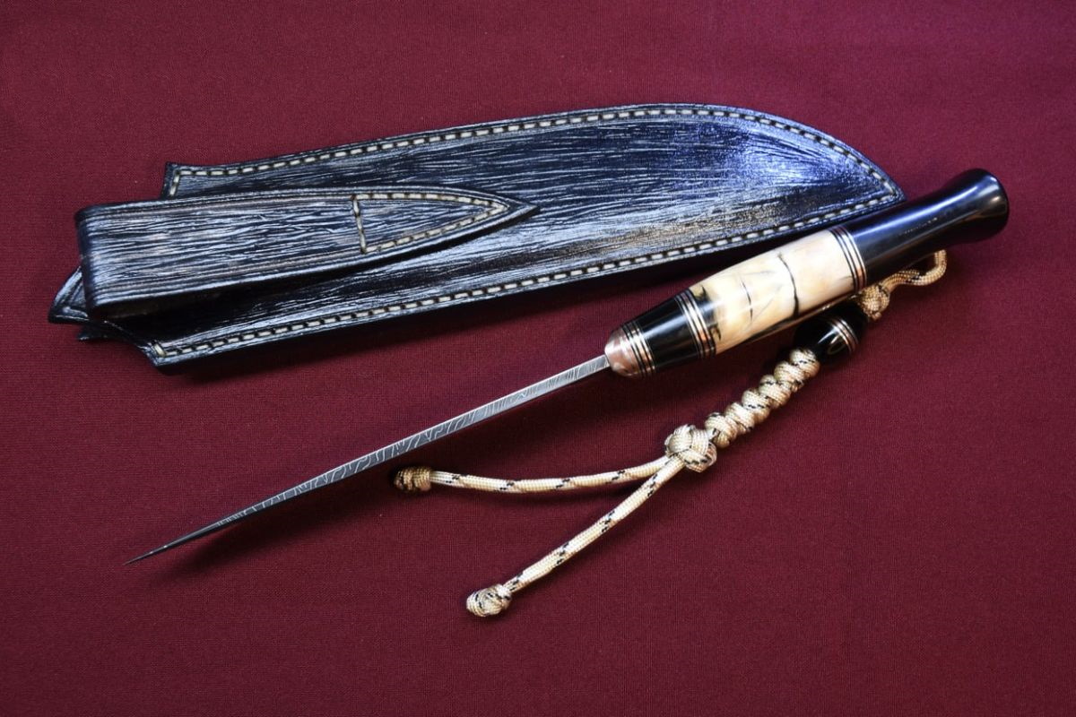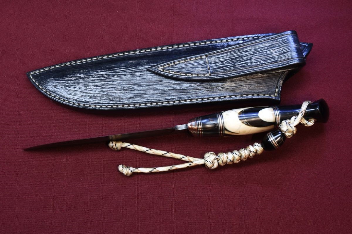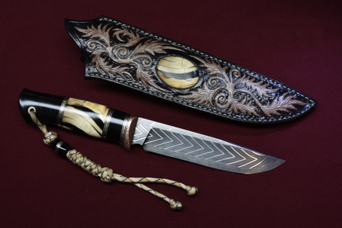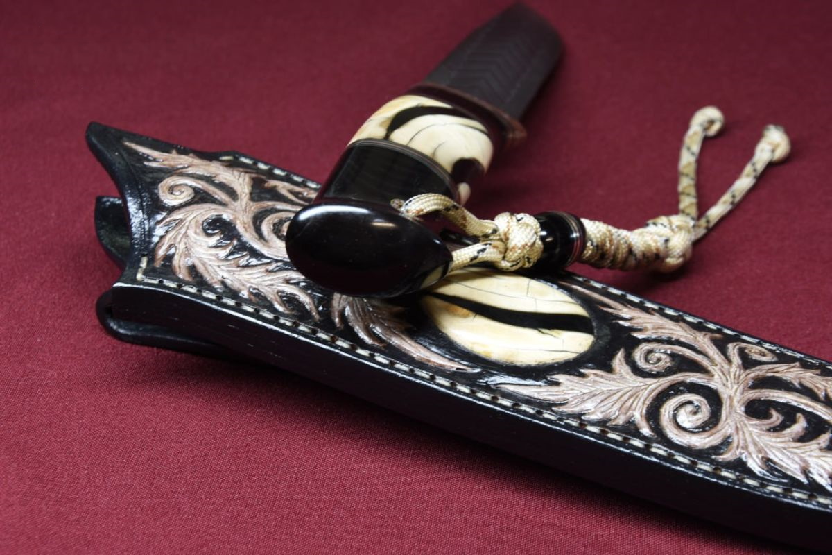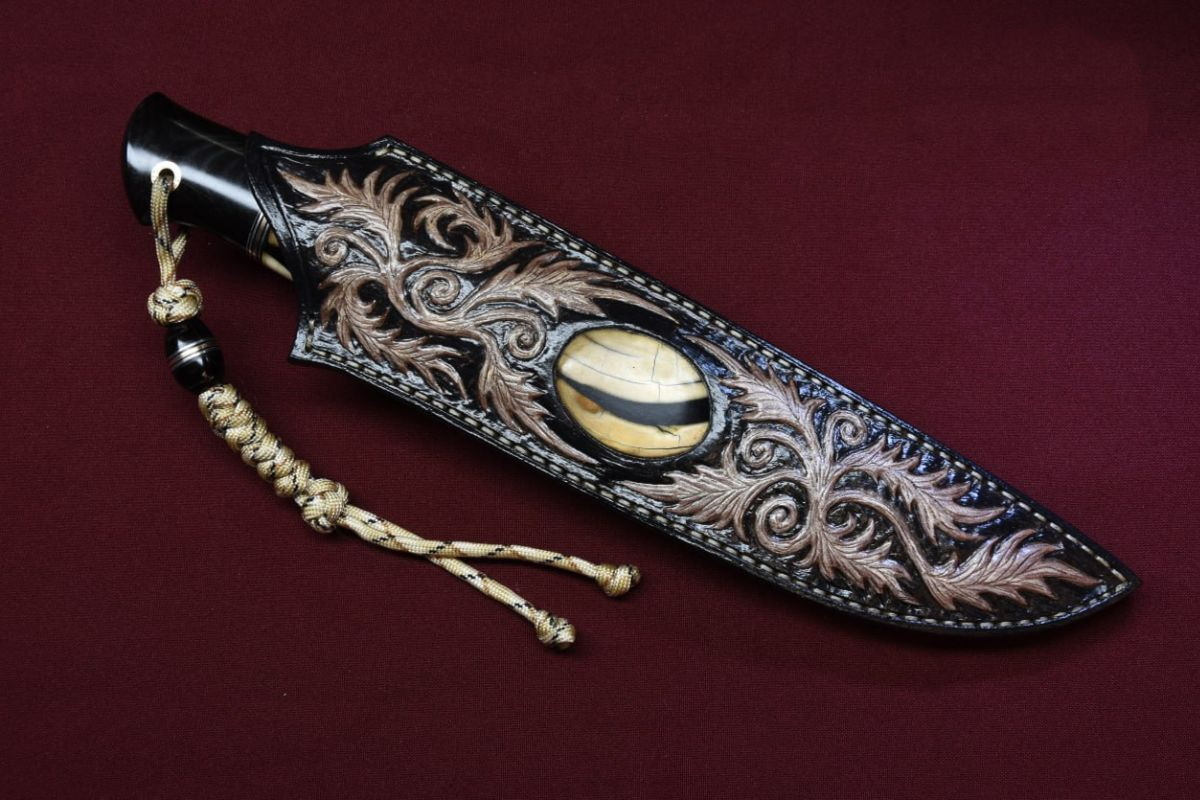 Ножны - итальянская кожа растительного дубления 3.5 мм, композитный вкладыш, стабилизированный бивень мамонта, тиснение, покраска, пропитка